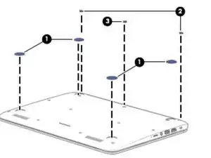 Переверните ноутбук задней панелью вверх. Вам нужно будет удалить четыре накладки, чтобы получить доступ к винтам. Сначала снимите центральную накладку, как показано на изображении.
