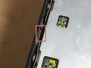 Подпереть угол рамки медиатором и отщёлкнуть кабель данных, перевернув его вверх на рамку.