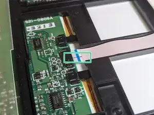 Отключите гибкий кабель крайний справа (синяя рамка).