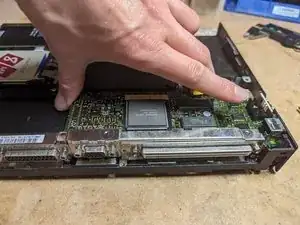 Используйте медиатор для гитары, чтобы поддеть плату процессора и вынуть её из разъёма, который находится непосредственно под областью с винтами.