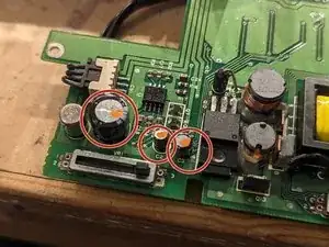 Конденсатор C18 (47 мкФ 6.3 В, диаметр 5 мм, высота 6 мм) почти всегда протекает на плате питания и должен быть заменён. Это также может вызвать значительные повреждения, травление переходных отверстий и дорожек. См. мою обратную расшифровку платы питания, если хотите попытаться отремонтировать.