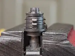 Если ослабите петлю слишком сильно, извлеките её из тисков и положите сверху тисков. Наденьте маленькую шестигранную отвёртку на штифт и постучите молотком, чтобы снова прижать фиксирующую шайбу.