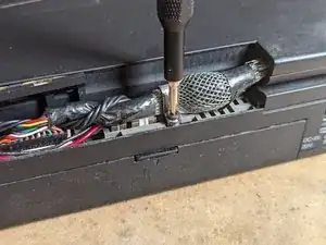 Внизу, рядом с платой питания: серебристый винт 6 мм (обратите внимание на необычную длину по сравнению с другими серебристыми винтами).