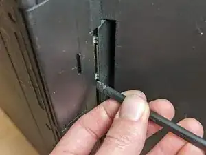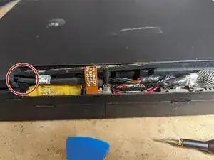 Вставьте два медиатора для гитары в металлические защёлки с левой стороны дисковода. Они должны пройти между металлической пластиной (красная рамка) и пластиковым корпусом.