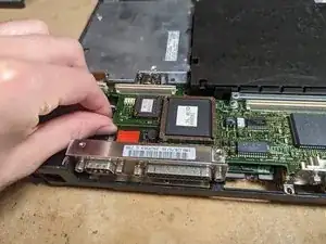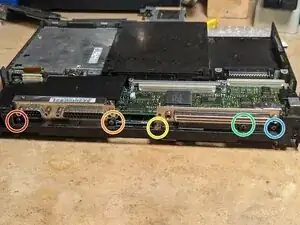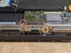 Удалите серебристый винт 4 мм между док-портом и VGA-разъёмом.