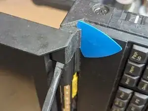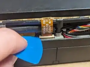 Отключите янтарный гибкий кабель, идущий к трекпойнту, с помощью лопатки.
