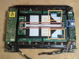 Снимите два гибких кабеля с углом 90 градусов (оранжевые рамки), снова убедившись, что записали их точную ориентацию и место установки.