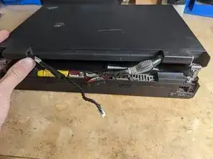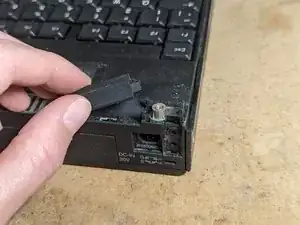 Удалите два серебристых винта 5 мм по обе стороны крышки гнезда для адаптера переменного тока.