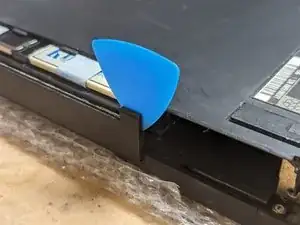С помощью лопатки аккуратно отожмите пластиковые защёлки крышки индикатора светодиода на задней стороне корпуса ноутбука.
