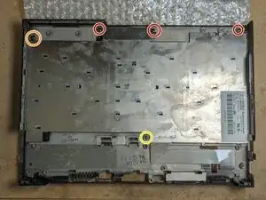 Удалите пять винтов из клавиатуры и пластину усиливающей планки кнопки трекпойнта.