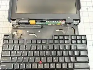 Теперь вы сможете поднять верхнюю панель вверх и вынуть её, обнажив плату преобразователя ЖК и направляющую клавиатуры.