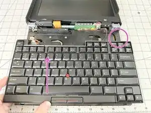 Чтобы снять клавиатуру, сдвиньте узел назад в сторону дисплея, освободив его из передних защёлок, и наклоните вверх в сторону дисплея.