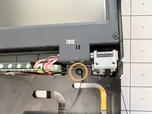 Удалите винт 6 мм (BC) при помощи битки T6 Torx с правой стороны у шарнира экрана.
