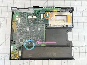 Используйте пластиковую лопаточку, чтобы прижать системную плату в указанном месте в следующем шаге для безопасного отсоединения дочерней платы от основной системной платы.