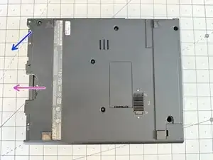 Снимите жёсткий диск, сдвинув кнопку разблокировки и вытолкнув его наружу. Жёсткий диск следует снимать после батареи и крышки PCMCIA, чтобы не повредить пластиковые защёлки.
