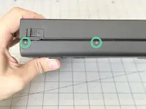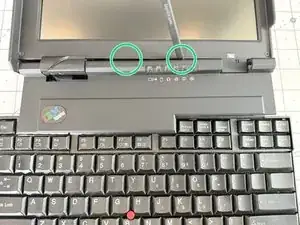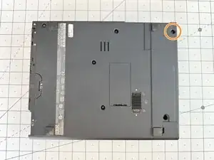 Переверните ноутбук так, чтобы шарнир экрана был от вас. Снимите винт 8 мм (BH) в верхнем левом углу при помощи битки T6 Torx.