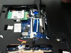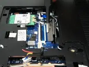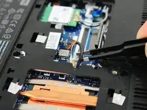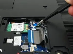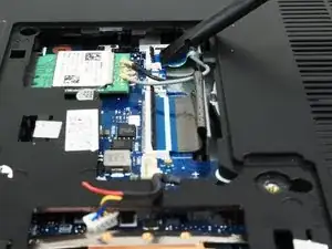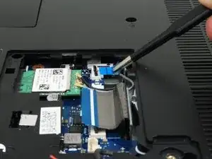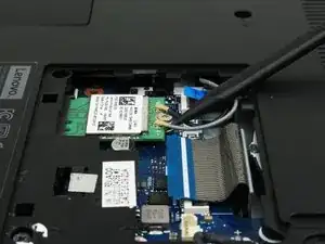 Используйте заострённый конец лопатки, чтобы аккуратно поддеть и отсоединить два антенных кабеля от беспроводной карты.
