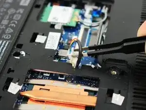 Используйте тупой пинцет, чтобы прямолинейно вытащить ленточный кабель тачпада из его порта.