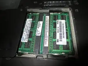 После того как вы выкрутили все тринадцать винтов, положите их в контейнер, чтобы не потерять. Старайтесь держать все нижние винты в одном контейнере, чтобы знать, какие винты куда идут. Теперь выкрутите два маленьких винта, которые удерживают крышку модуля оперативной памяти. Отложите крышку и затем выньте планки оперативной памяти.