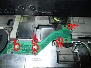 Красные круги со стрелками показывают, что удерживает винт. Нижний красный круг указывает, что это винт шасси, который нужно вынуть. Верхний красный круг показывает, что винт держит клавиатуру вместе с шасси.