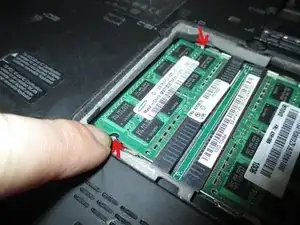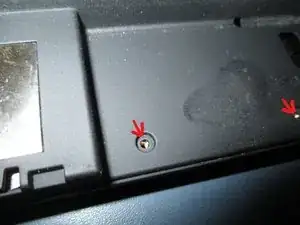 Переверните ноутбук дном вверх, чтобы найти тринадцать крестовых винтов. Красные круги со стрелками указывают расположение винтов. Теперь возьмите маленькую плоскую отвёртку и нажмите на защёлку, удерживающую аккумулятор. Удалите аккумулятор прежде, чем продолжать. Также видны винты, которые держат крышку модуля оперативной памяти.
