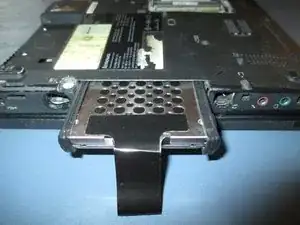 Начните извлекать SATA‑накопитель из корзины жёсткого диска. С него снимается небольшой пластиковый кожух. Потяните чёрную ленту — это облегчит извлечение диска.