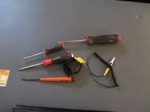 На фотографиях показаны два крестовых отвёртки: одна номер 0 и одна номер 1. Две плоские отвёртки: одна маленькая и одна стандартного размера. Стандартный антистатический браслет и пластиковая кредитная или бонусная карта. На фото не показан антистатический пакет — он будет показан позже.