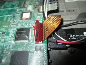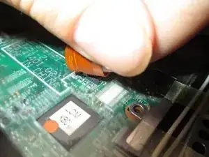 Когда клавиатура ослаблена, приподнимите её, чтобы увидеть шлейф клавиатуры. В этой клавиатуре разъём, подключённый к материнской плате, просто отщёлкивается вверх. В некоторых ноутбуках есть ленточный кабель с защёлкой. Отсоедините клавиатуру от материнской платы и отложите в сторону.