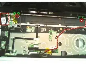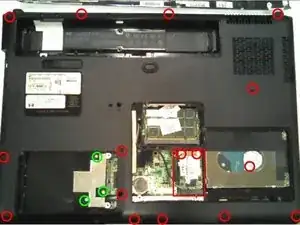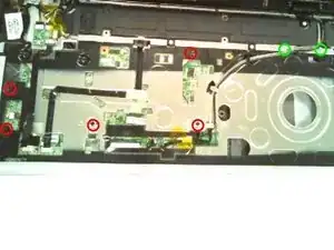 Снимите 5 чёрных винтов (обозначены красными кружками) и 2 серебристых винта (зелёные кружки) в области, где была клавиатура.