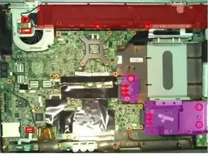 Начните с двух фиолетовых областей внизу слева на изображении. Нижняя — слот ExpressCard, а верхняя — разъём для DVD. Снимите серебристые винты, показанные кружками на изображении, и сдвиньте платы в сторону по направлению красных стрелок.
