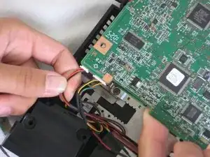 Найдите кабель питания вентилятора и тяните вверх вблизи разъёма.