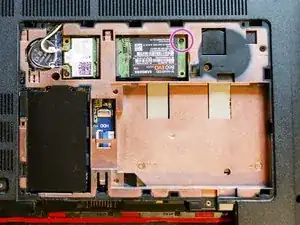 Отверткой PH#00 выверните винт Phillips PM 2.0x2.5, фиксирующий SSD к нижней крышке: модуль SSD сразу приподнимется.