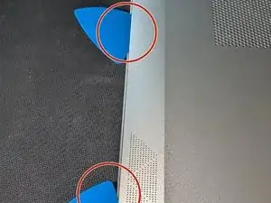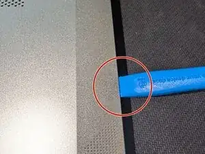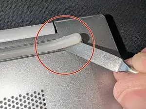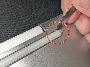 Пластиковой лопаткой или рычагом осторожно пройдитесь вокруг верхнего края ноутбука, там, где экран соединяется с корпусом, между двумя шарнирами.