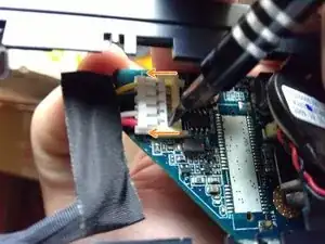 Плоской отверткой отсоедините силовой кабель, расположенный в верхнем левом углу материнской платы.