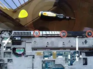 Удалите 2 винта под клавиатурой, расположенные в нижнем левом углу.