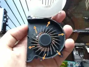 Маленькой щёткой или зубной щёткой удалите пыль. ОСТОРОЖНО: лопасти вентилятора ОЧЕНЬ хрупкие, не прилагайте чрезмерного усилия пальцами.