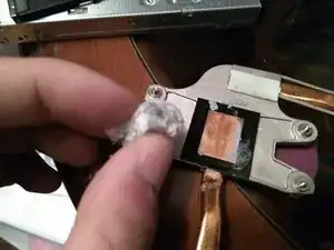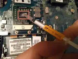 Нанесите небольшое количество новой термопасты на металлическую поверхность процессора.