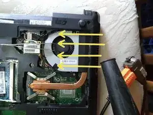 Используйте воздушный blower для удаления пыли из вентилятора. Следует избегать прокручивания его плоскогубцами. Поток должен быть противоположен нормальной циркуляции, когда ноутбук включен. Используйте маленькую щетку для loosening пыли.