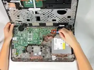 Используя пластиковый инструмент для открытия, отключите черный разъем динамика в верхней правой части материнской платы.