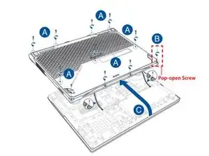 Удалите винты с крышки отсека. Как показано на диаграмме, сначала открутите винты с меткой "A". Не откручивайте винт "B" от крышки.