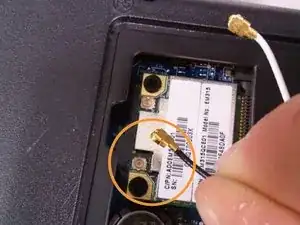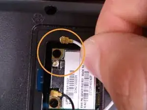 ПРИМЕЧАНИЕ: Возможно, придётся сдвинуть антенну беспроводной связи. Обратите внимание на направляющую справа от моего пальца, через которую проходит провод. Убедитесь, что провод выведен из этой направляющей.