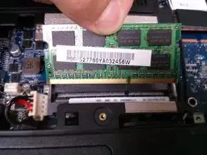 Поднимите за середину модуля памяти и выньте его из разъёма.