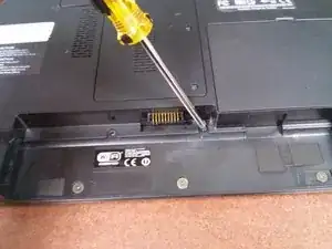 Снимите аккумулятор — отведите защёлки, фиксирующие аккумулятор на дне ноутбука, по обеим сторонам аккумулятора.