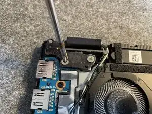 Отворачиваем винт левой петли экрана с помощью отвёртки.