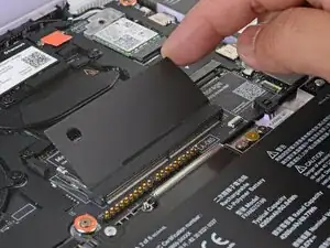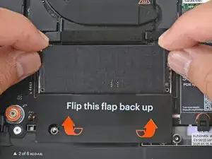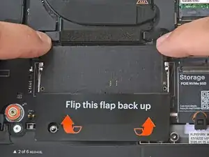 Удерживайте чёрный фиксатор SSD пальцем, чтобы держать его в открытом положении.