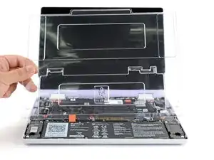 Положите ноутбук экраном вверх на чистую рабочую поверхность.