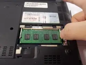 Осторожно извлеките планку RAM, тянув под тем же углом 45°, под которым она сейчас находится, до того момента, как она отсоединится от устройства.
