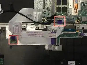 Используйте нейлоновую лопатку, чтобы поднять язычок ZIF-разъема. Аккуратно вытяните шлейф тачпада.
