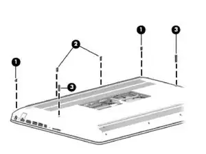 Всего нужно удалить одиннадцать винтов. HP удобно сгруппировала их по типу в три группы (1), (2), (3). Я использовал стандартный набор iFixit и обнаружил, что отвёртка была слишком короткой, чтобы дотянуться до одного из винтов в группе 2. Чтобы исправить это, мне пришлось немного расширить отверстие, чтобы отвёртка могла достать.