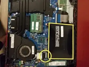 Здесь я выделил аккумулятор и кабель, который нужно отсоединить (Не обращайте внимания на пыльный вентилятор, это фото сделано до чистки ноутбука).